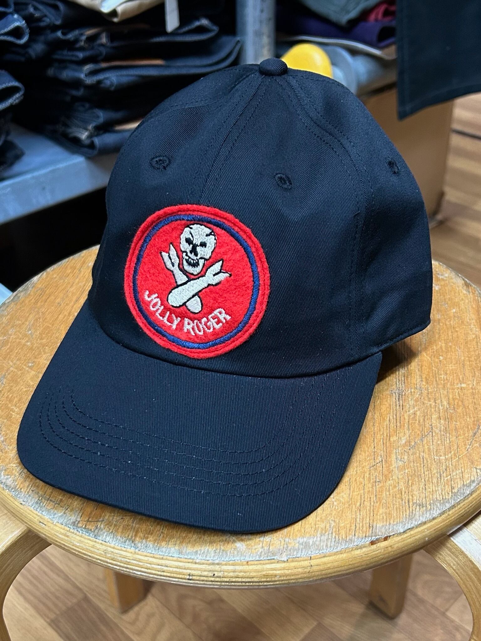 ジョリーロジャースのベースボールキャップ。アメリカが第二次世界大戦に参戦した直後、第90爆撃群はB-24重爆撃機部隊として活動を開始。その後3年間、太平洋戦域に配備され、特に最初の1年間は激戦区での24時間体制の任務を遂行した。士気の低下が懸念される中、指揮官アーサー・H・ロジャース大佐の献身的なリーダーシップもあって大きな戦果を上げることになる。隊員たちはその功績を称え、ロジャース大佐にちなんだ愛称「ジョリー・ロジャース」を提案。これは海賊旗を意味し、ドクロとクロスボムのエンブレムも併せて採用されたのである。