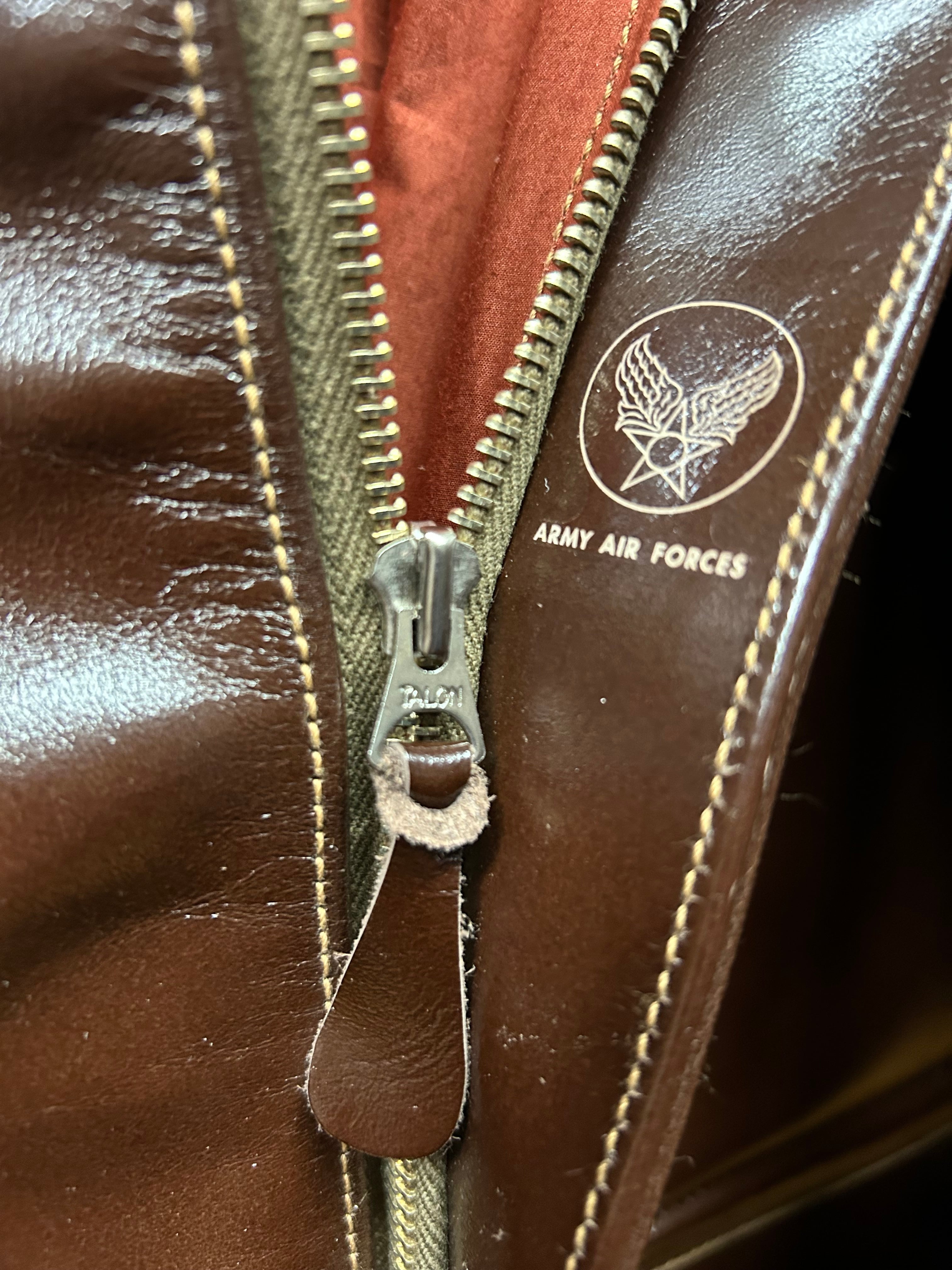 米陸軍航空隊は1942年の途中から"プロパティー・エアフォース"の表記を義務付けしたため2枚のラベルを重ねて縫い付けるツインラベルが特徴となっている。