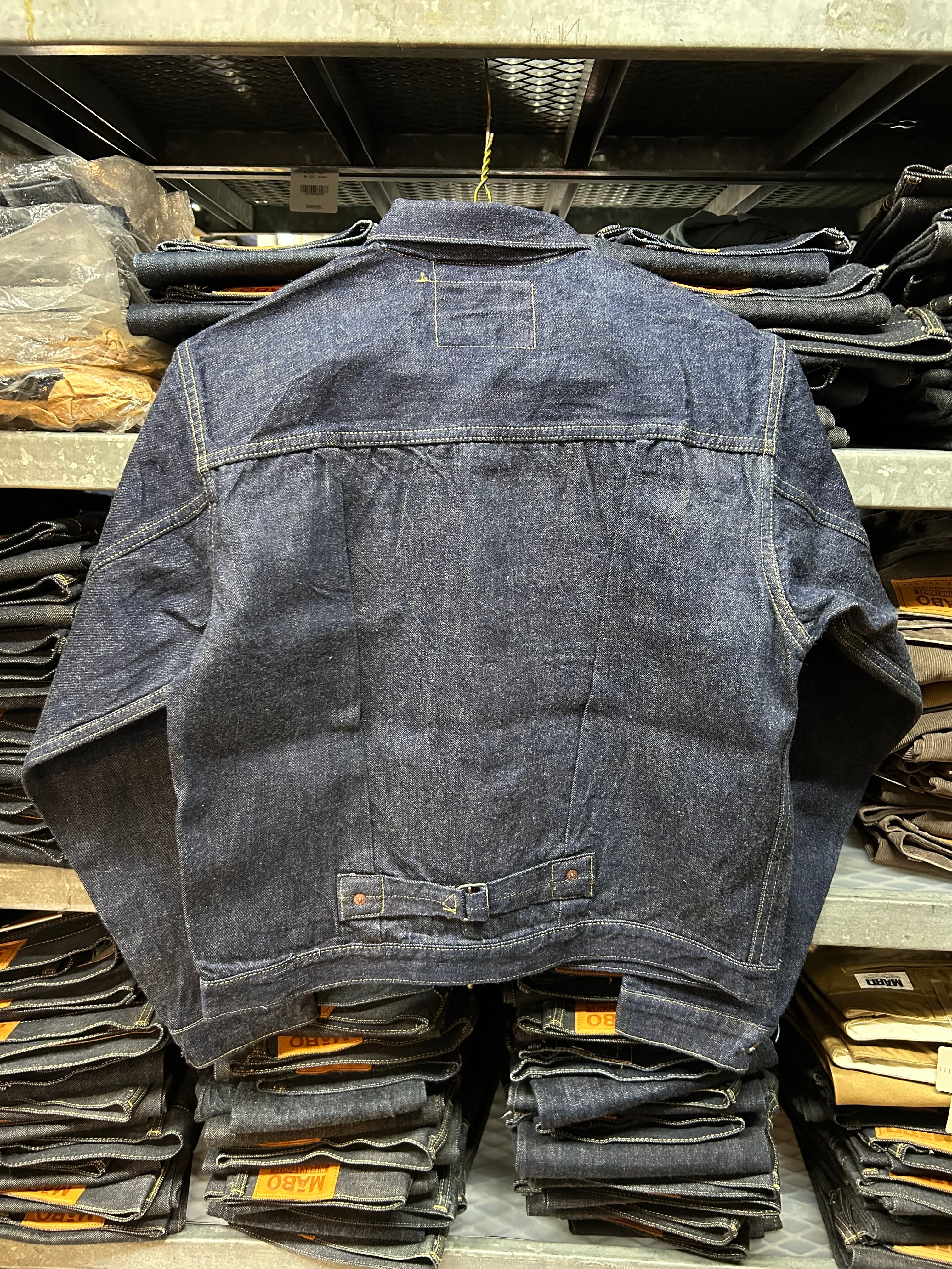 ベジタブルタンニングのディアスキンラベル。鉄製の唐草柄ドーナツボタン。左身頃のプリーツステッチは縫い始まりと終わりが上で、右身頃は下が縫い始まりと終わりになる。手作り感のあるポケットステッチ。見返し裏にはセルビッジが見える。運動性を与えるプリーツ。手作り感のあるステッチとリベット位置。地の目を縦使いしたカフス。横使いと表情が変わってくる。ざらつきのある13.6oz.のオリジナルデニム。